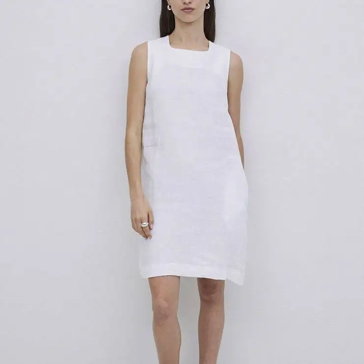 Vestido corto en tejido 100% lino. Tintura Oeko Tex. Diseño recto. Escote cuadrado. Sin mangas. Cierre con cremallera y gancho en la espalda. Dos bolsillos laterales.
