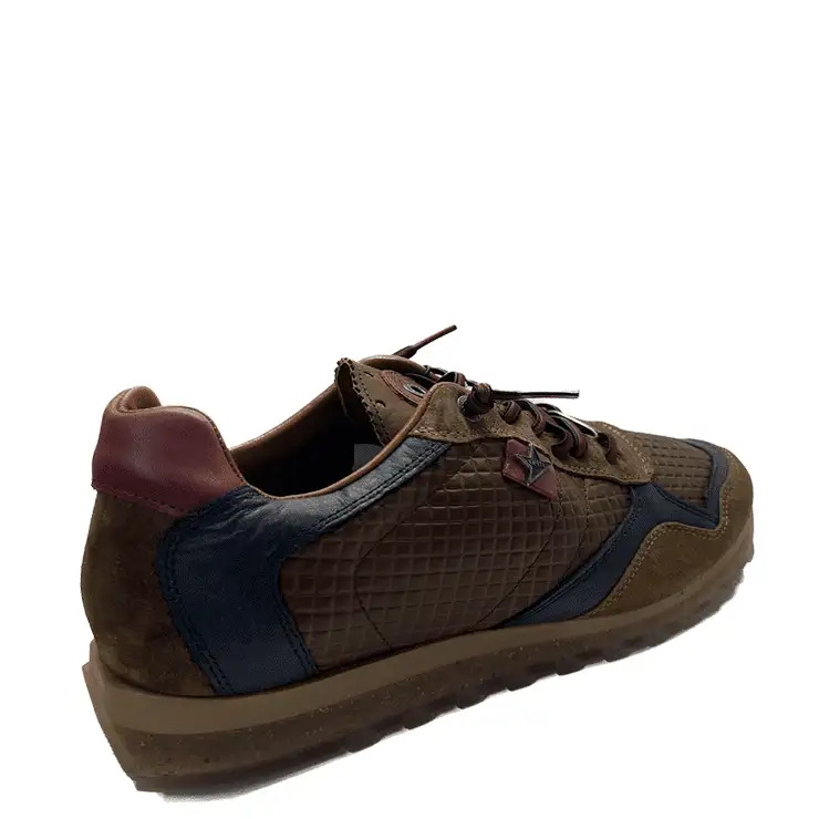 Zapatillas de la marca Cetti modelo C-848 en color cuero con detalles en azul. Zapatillas deportivas elaboradas en piel grabada, cierre mediante cordones elásticos. Plantilla de piel acolchada. Suela de goma con acabado transparente.
