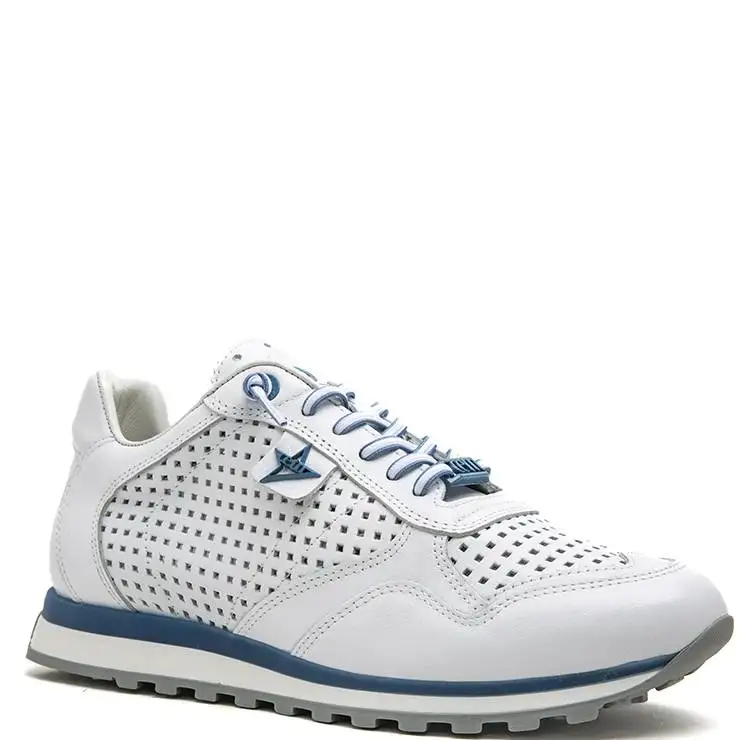 Zapatillas deportivas elaboradas en piel troquelada en color blanco con detalles en azul. Suela plana de goma con detalle de corcho. Cierre con cordones.
