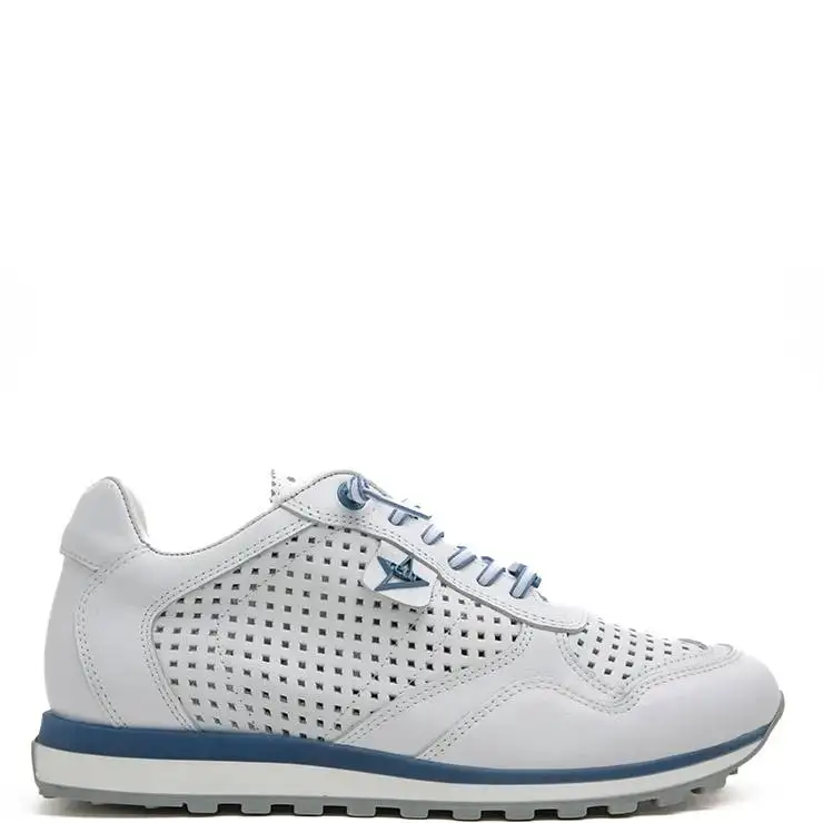 Zapatillas deportivas elaboradas en piel troquelada en color blanco con detalles en azul. Suela plana de goma con detalle de corcho. Cierre con cordones.