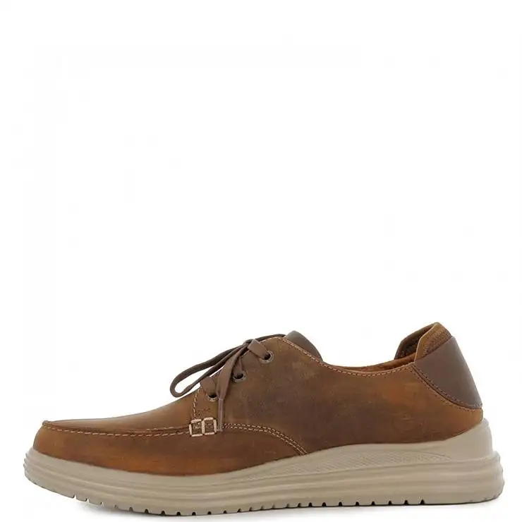 Zapato tipo blucher elaborada en cuero engrasado liso. Cierre con cordones. Plantilla acolchada Skechers Air-Cooled Memory Foam. Suela de goma de tracción flexible. Diseño de puntera de mocasín casual.