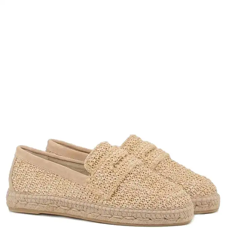 Alpargata tipo mocasín elaborada en rafia trenzada. Forro y plantillas acolchadas de piel. Detalle de antifaz en el empeine. Suela de yute ecológico de 1,5 cm de altura. Sin cierre.