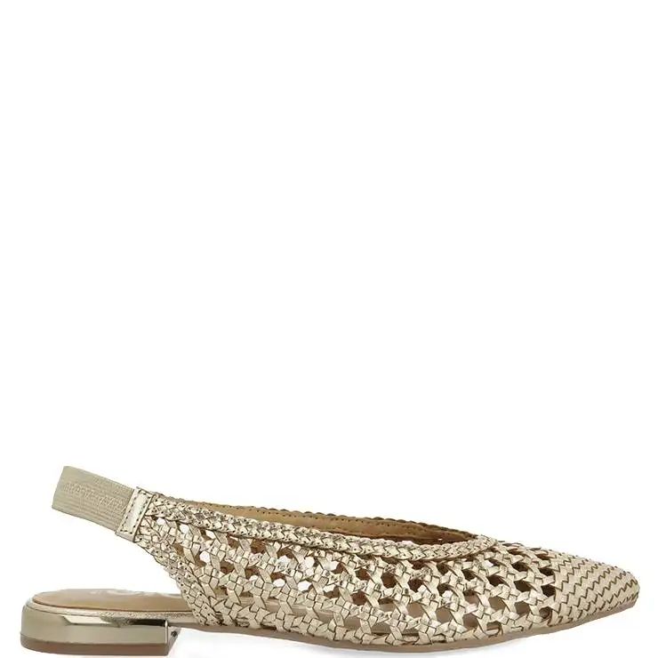 Bailarina destalonada elaborada en piel trenzada. Tira trasera elástica. Forro y planta de piel. Planta acolchada en látex. Tacón metalizado de 1 cm.
