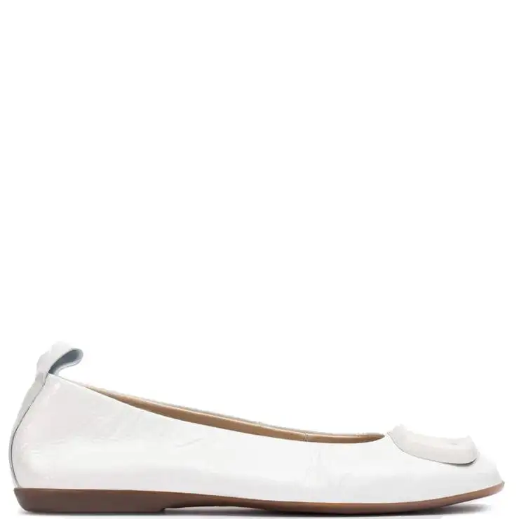 Bailarina elaborada en charol arrugado. Detalle de gran hebilla al tono. Tira trasera para ayudar el calce y puntera cuadrada. Plantilla Memory Gel. Cómoda suela de goma antideslizante.