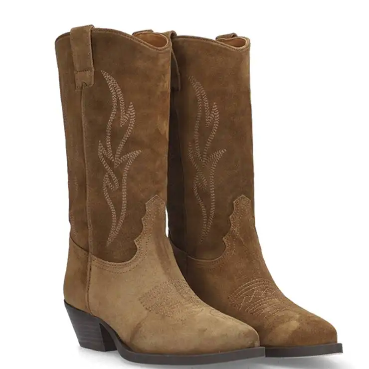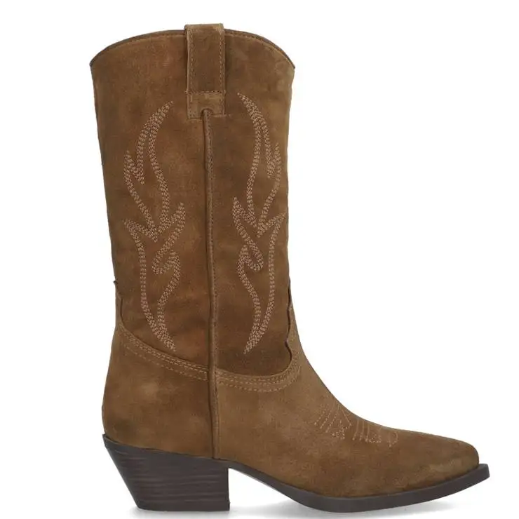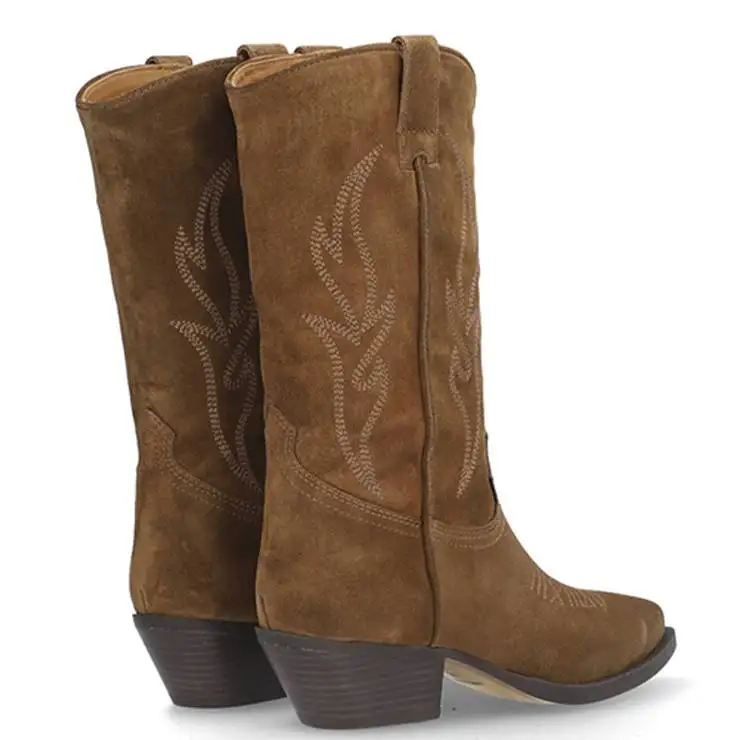 Bota estilo cowboy elaborada en piel de ante. Detalle bordado. Tirador en los laterales para facilitar el calce. Forro interior en piel y plantilla acolchada. Tacón de 5 cm de altura. Suela antideslizante y puntera afilada.