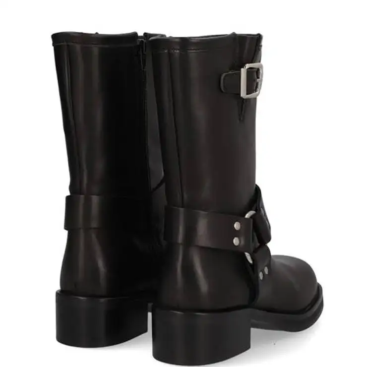 Bota tipo motero elaboradas en piel (napa). Suela de goma con tacón de 5 cm, suela antideslizante y puntera cuadrada, con cierre mediante cremallera y caña media. Detalle de anilla metálica y hebilla.
