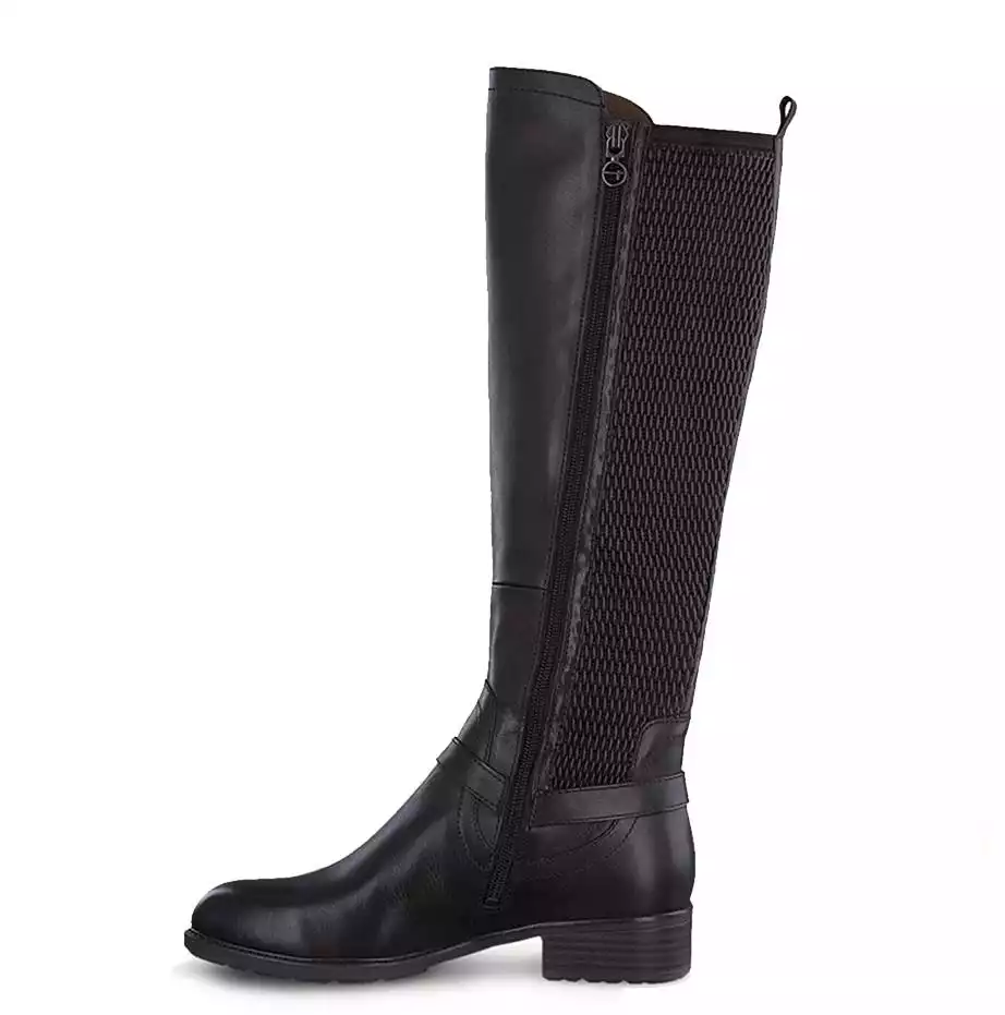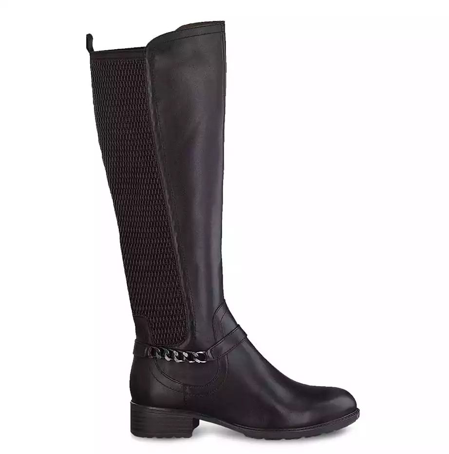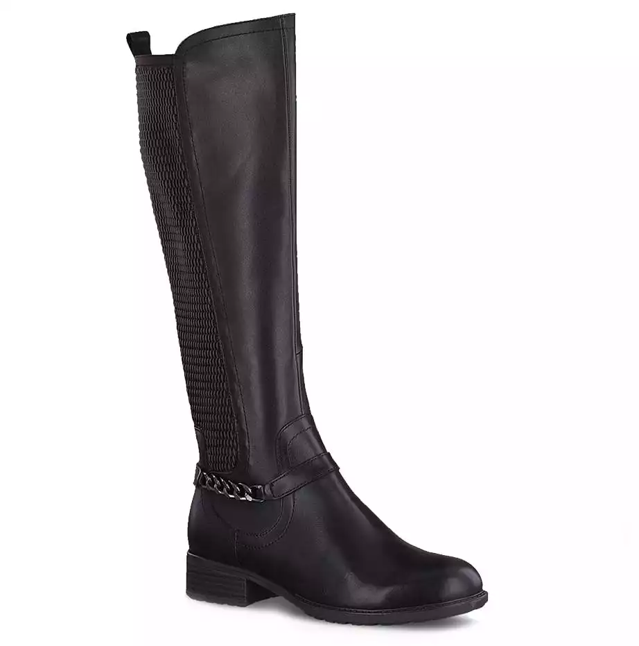 Bota de la marca Tamaris modelo 2551-29 en color negro. Bota de tacón elaborada en piel y material textil elástico drapeado. Tacón de bloque de 3 cm de altura. Cierre con cremallera lateral interior. Suela Touch-it de gran comodidad. Detalle de cadena en el tobillo.