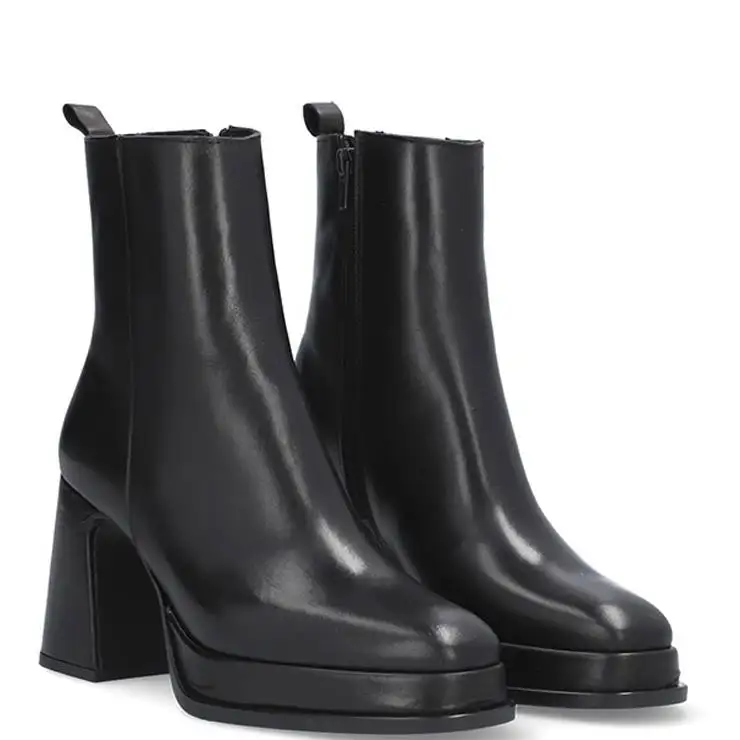 Botín de tacón elaborado en piel. Cierre de cremallera lateral. Suela de goma antideslizante de 2,5 cm y tacón forrado de 8,5 cm.