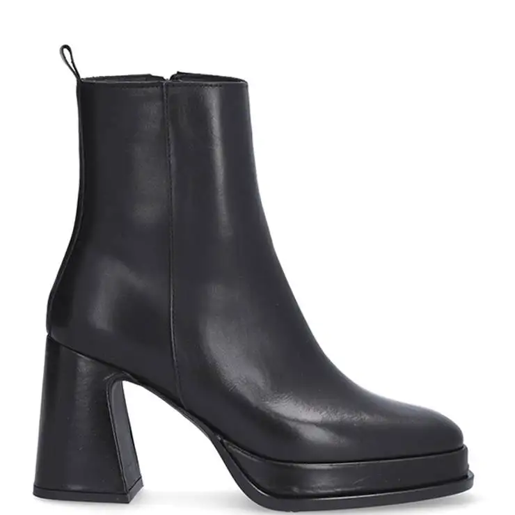 Botín de tacón elaborado en piel. Cierre de cremallera lateral. Suela de goma antideslizante de 2,5 cm y tacón forrado de 8,5 cm.