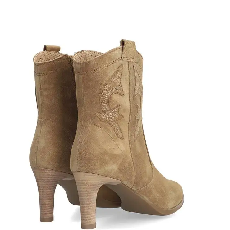 Botín estilo campero elaborado en piel (baby silk). Tacón fino de 5 cm. Suela de goma antideslizante y puntera redonda. Cierre mediante cremallera y caña media.