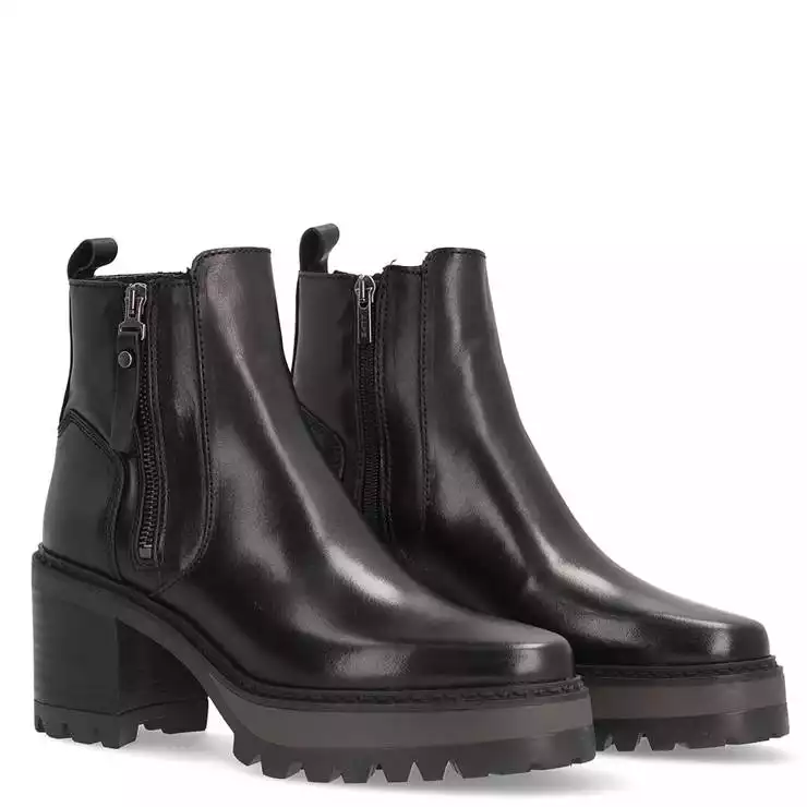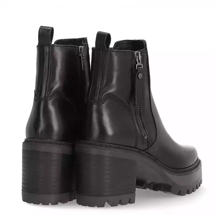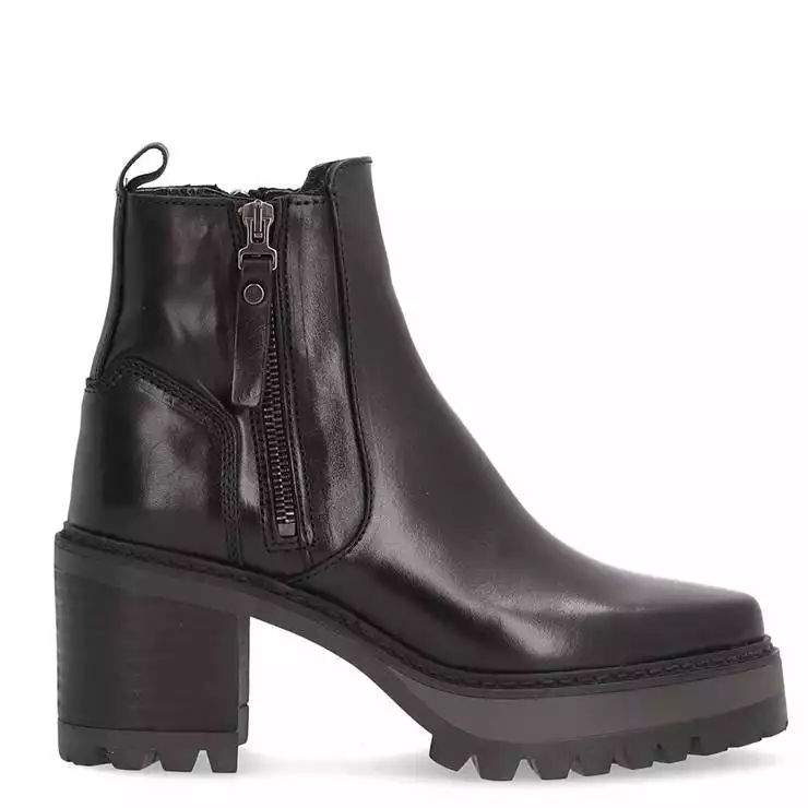 Botín de la marca Alpe modelo New Amelie en color negro. Botín elaborado en piel. Cremallera en ambos laterales. Tirador trasero. Suela dentada antideslizante con tacón de 7 cm.