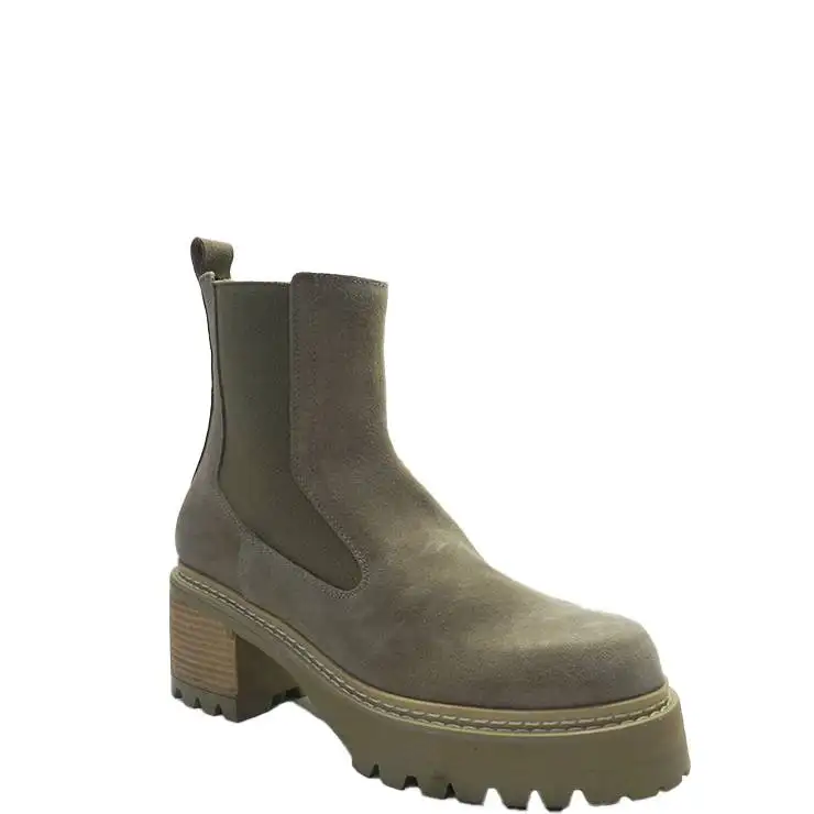 Botín elástico elaborado en serraje gamo. Suela de goma con plataforma de 3 cm y tacón bloque de 6,5 cm. Elásticos en los laterales.