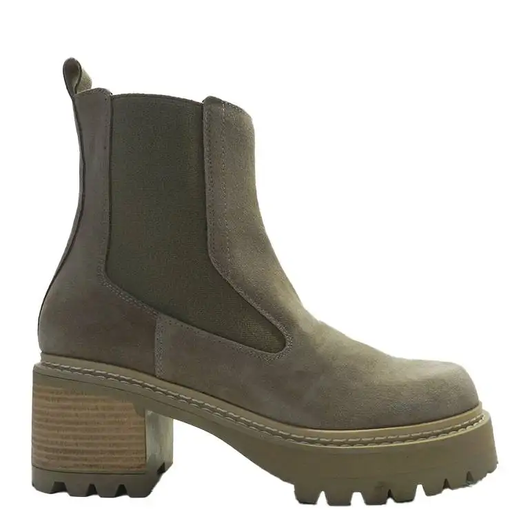 Botín elástico elaborado en serraje gamo. Suela de goma con plataforma de 3 cm y tacón bloque de 6,5 cm. Elásticos en los laterales.