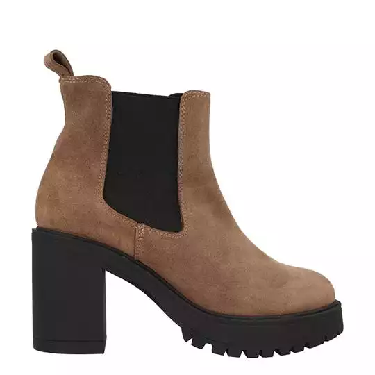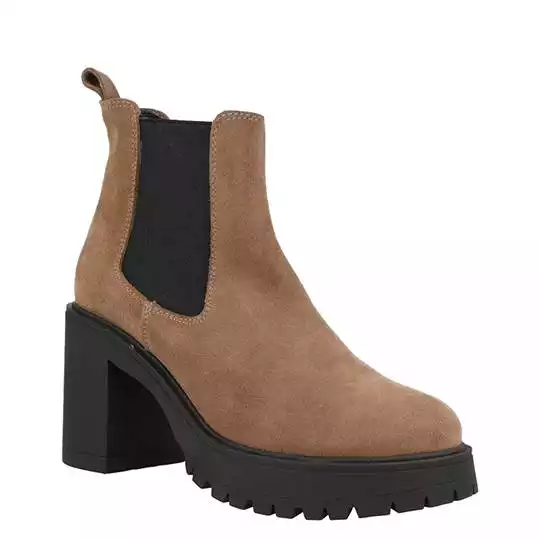 Botín de la marca Escala modelo Ingrid en color cuero. Botín bajo confeccionado en ante. Elásticos en los laterales en tono oscuro. Suela de goma dentada en color negro y tacón de goma cuadrado. Tacón ancho de 5 cm de altura.
