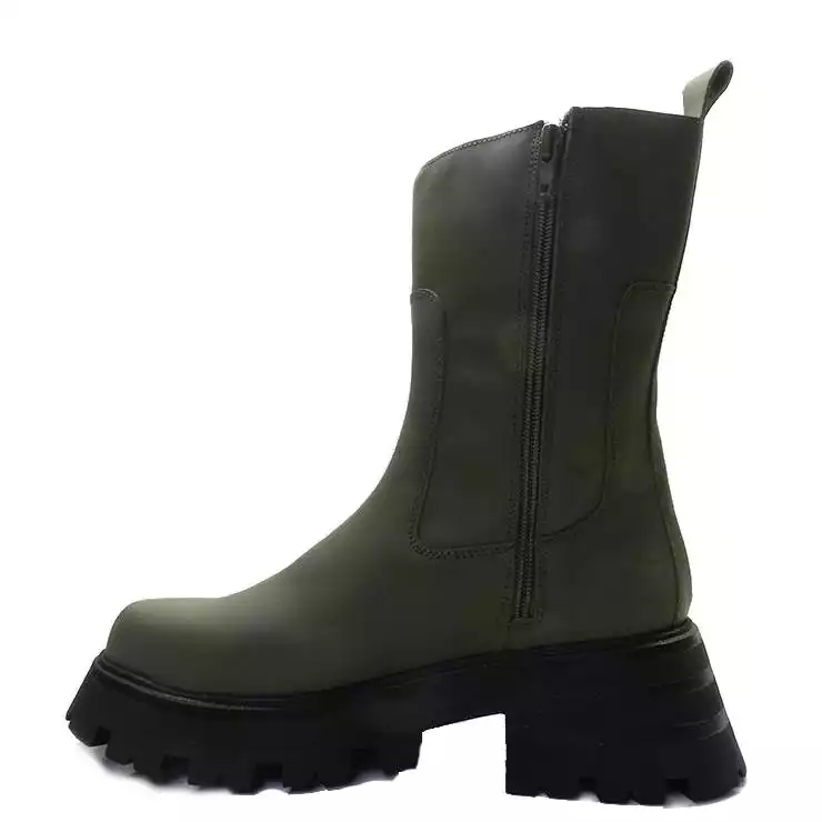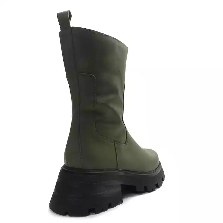 Botín de la marca Escala modelo Queen en color kaki. Botín estilo Chelsea de napa mate, cierre con cremallera lateral interna y tira para facilitar el calce. Suela de goma dentada negra de 5 cm.