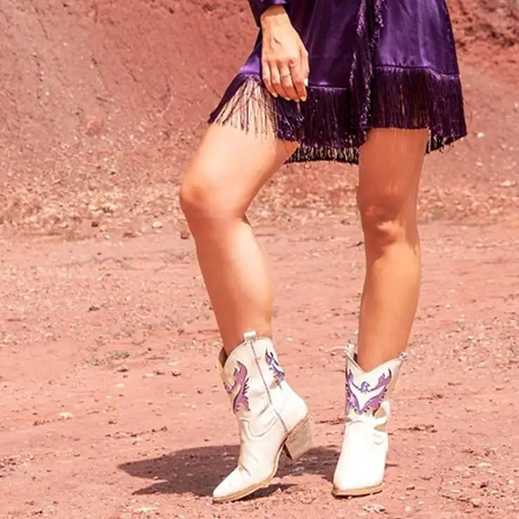 Botín estilo cowboy en piel blanca con detalles en lila metalizado. Suela de goma y tacón campero de 6,5 cm de altura. Plantilla piel. Sin cierre, con tirador en la parte superior para facilitar el calce.