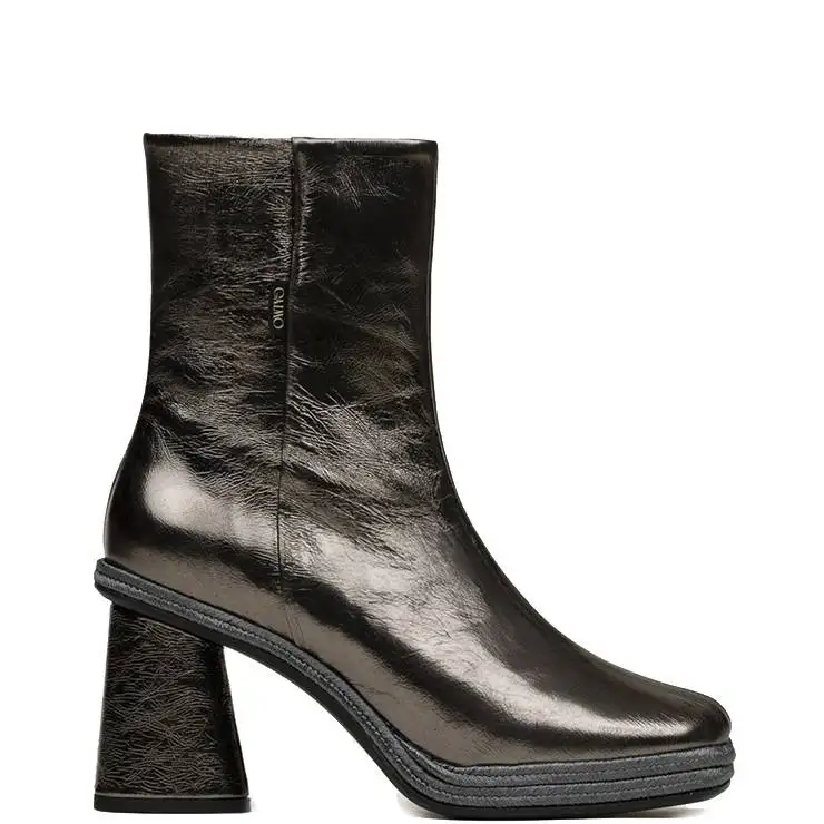 Botín elaborado en piel metalizada, puntera cuadrada y cremallera interior. Forro y plantillas acolchadas transpirables. Suela de caucho con tacón forrado en piel de 8,5 cm y plataforma delantera de 2,6 cm.