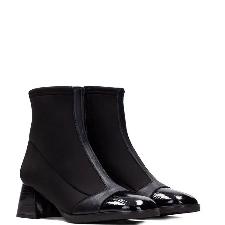 Botín elaborado en piel y tejido elástico. Tacón bloque de 5 cm de altura. Punta redonda de charol. Cierre de cremallera en el empeine. Plantilla tecnología Triflow extraíble. Suela de TPU.