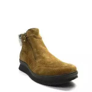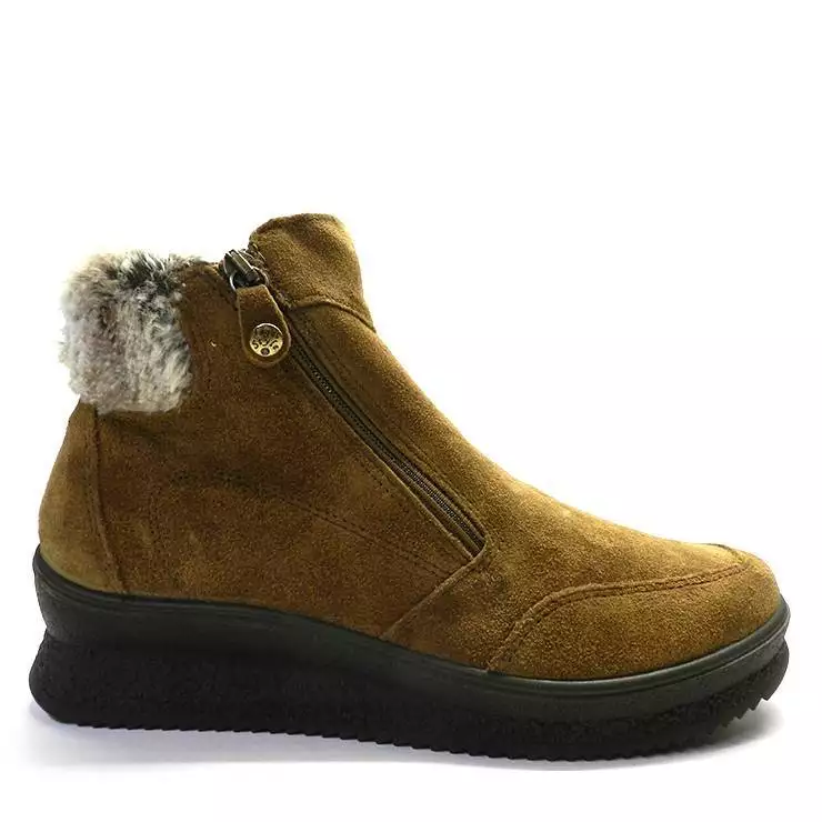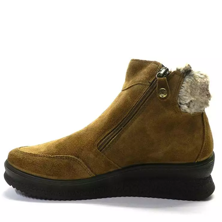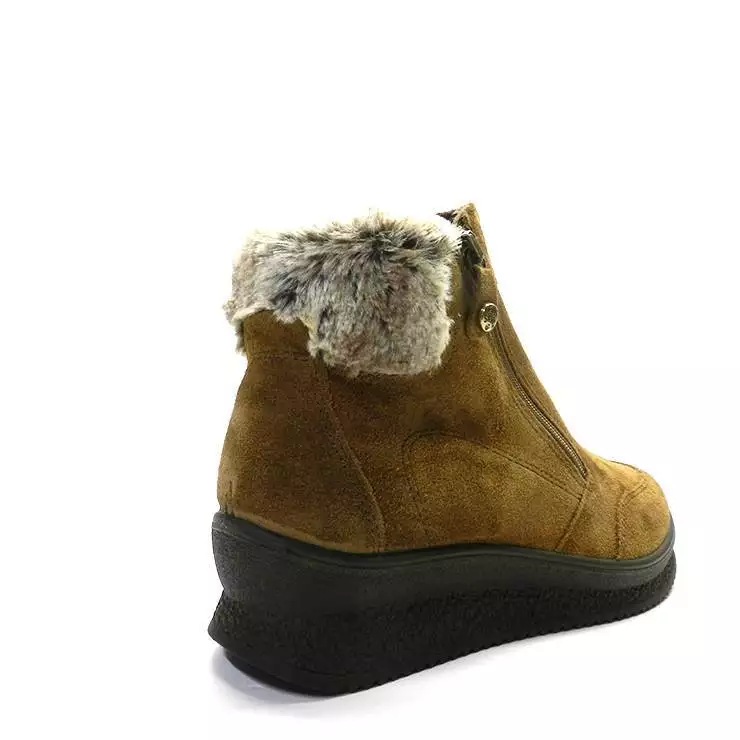 Botín de la marca Imac, modelo 806341 en color cuero. Botín de ante con cremallera en ambos lados. Detalle con pelo en la parte trasera. Suela de goma en cuña de color negro.