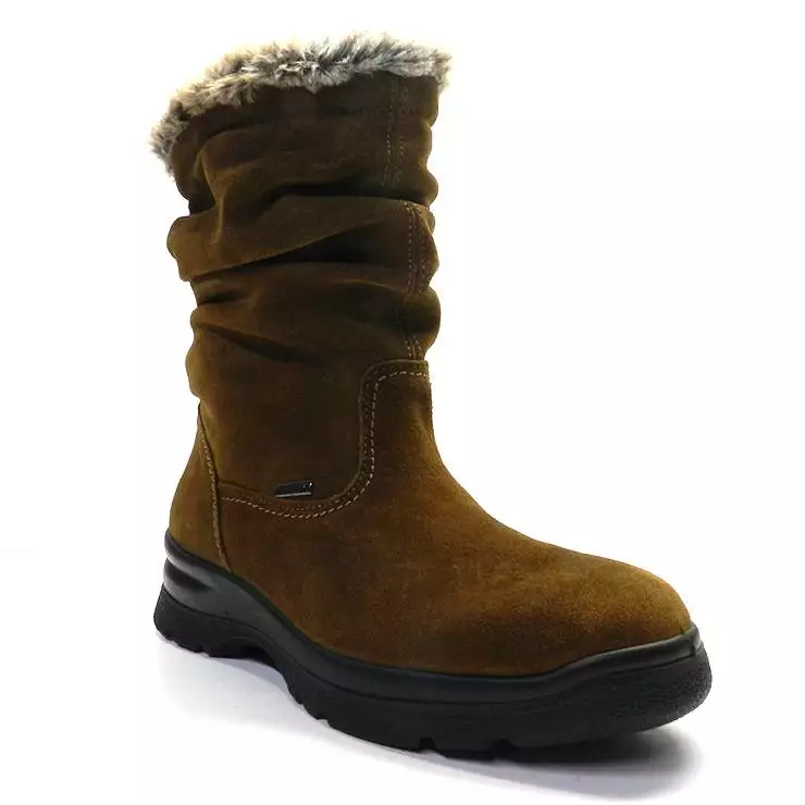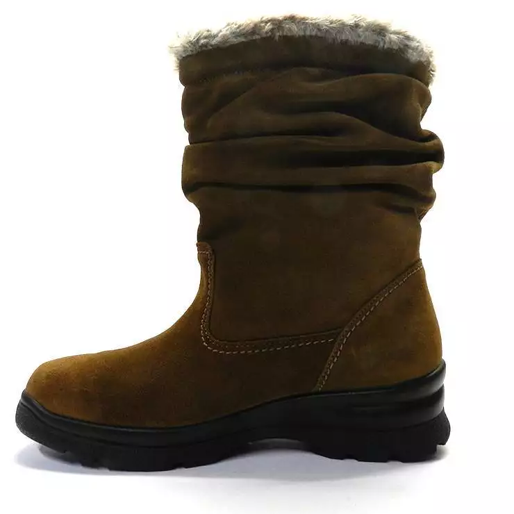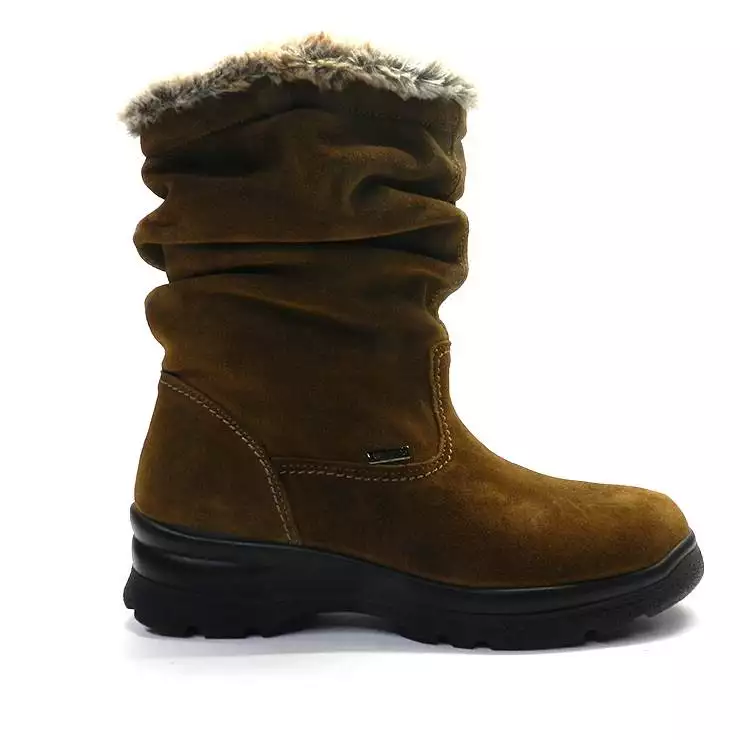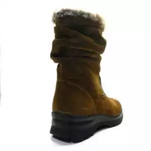 Botín de la marca Imac, modelo 807369 en color marrón. Botín de serraje con detalle de pliegues en la caña. Detalle con pelo en la parte superior. Suela de goma en cuña de color negro.