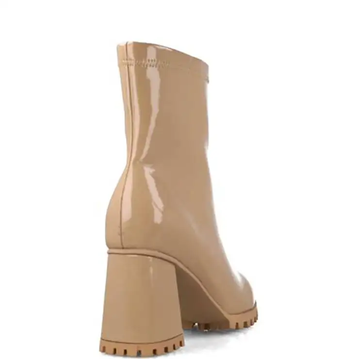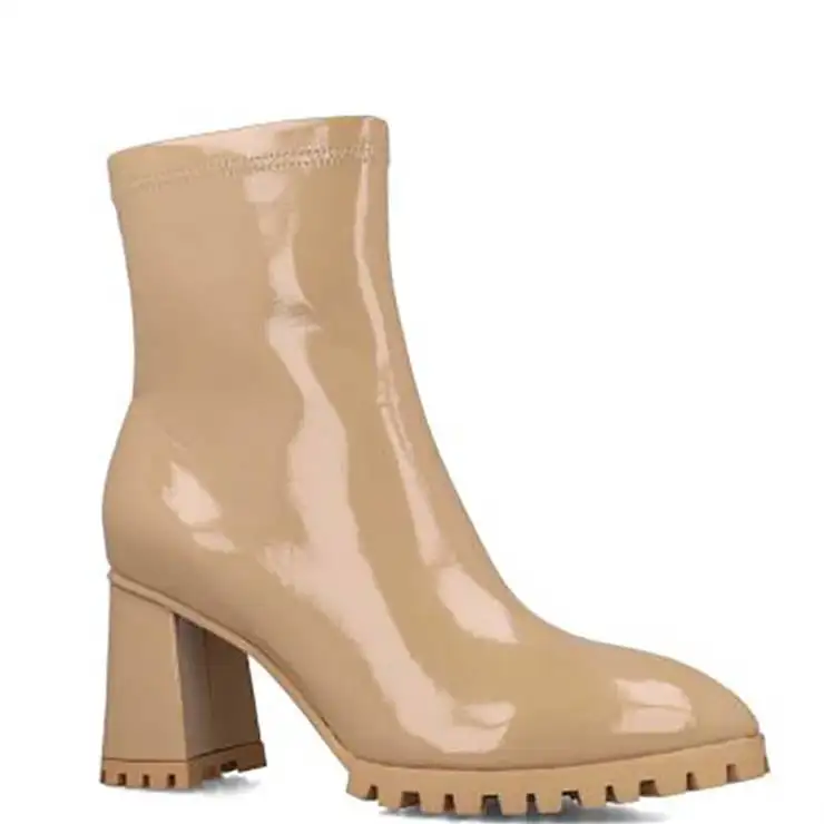 Botín con tacón elaborado en charol. Detalle de costura central. Suela dentada de goma con tacón al tono de 5 cm. Cierre con cremallera.
