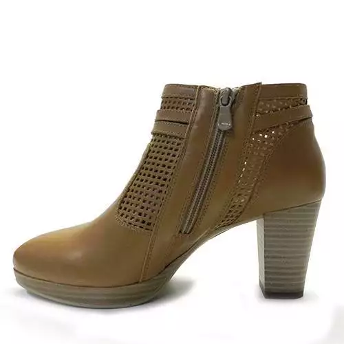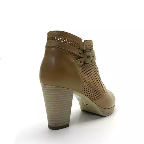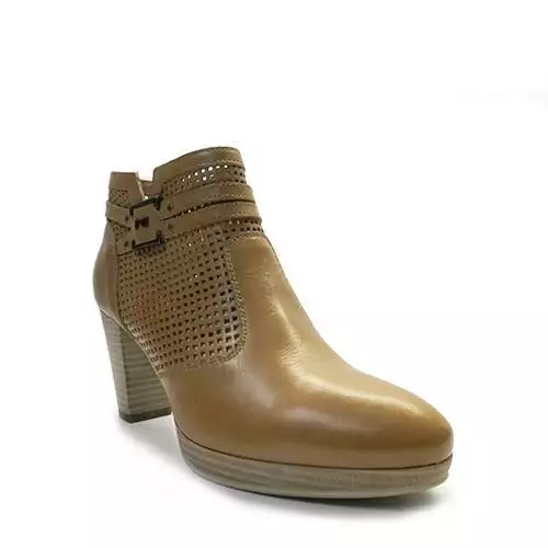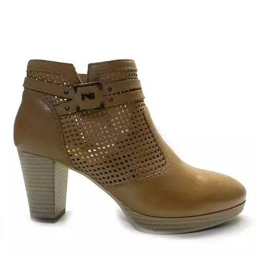 Botín de la marca Nero Giardini modelo 217850D en color cuero. Botín de tacón en combinación de piel lisa con piel perforada estilo rejilla. Cierre con cremallera interior. Detalle de tachas y logo en el tobillo y dos tiras en piel lisa.