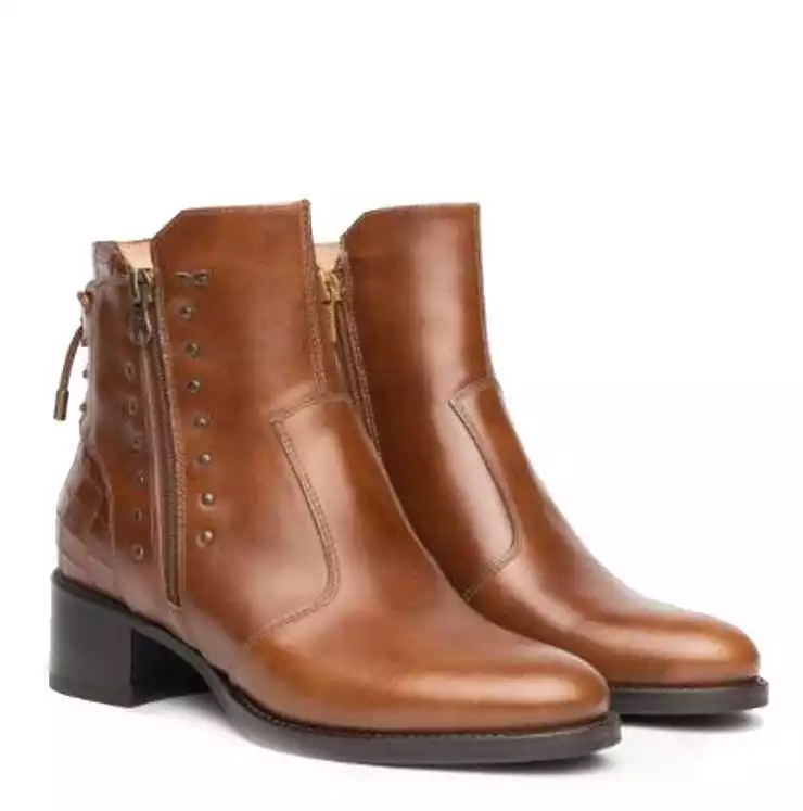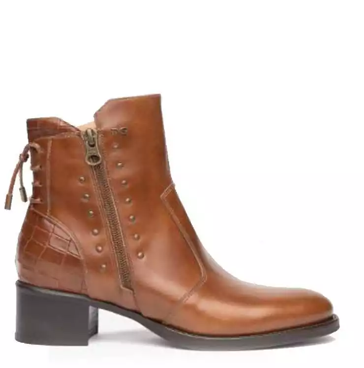 Botín de la marca Nero Giardini modelo I116761D en color cuero. Botín de piel lisa y detalle coco en el talón. Cordón en la parte trasera y cremallera en ambos laterales con detalle de tachuelas. Plantilla DryGo! que absorbe humedad y garantiza confort. Tacón block de 4 cm.