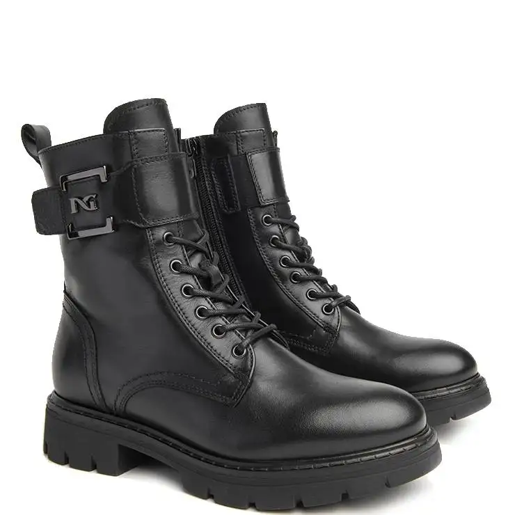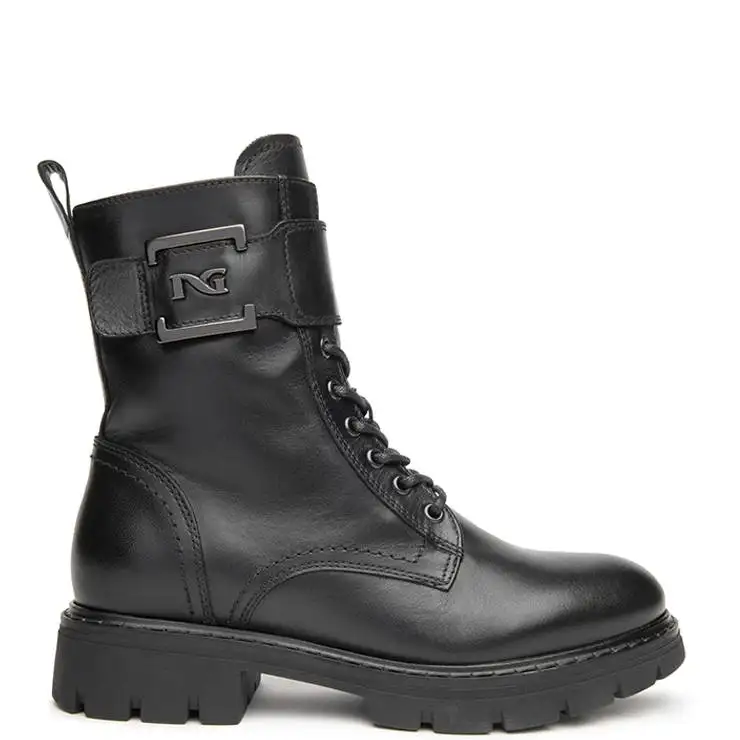 Botín de piel de estilo militar con solapa cerrada por hebilla. Suela de goma tanque con tacón block de 3 cm. Cierre con cordones y cremallera lateral interna.