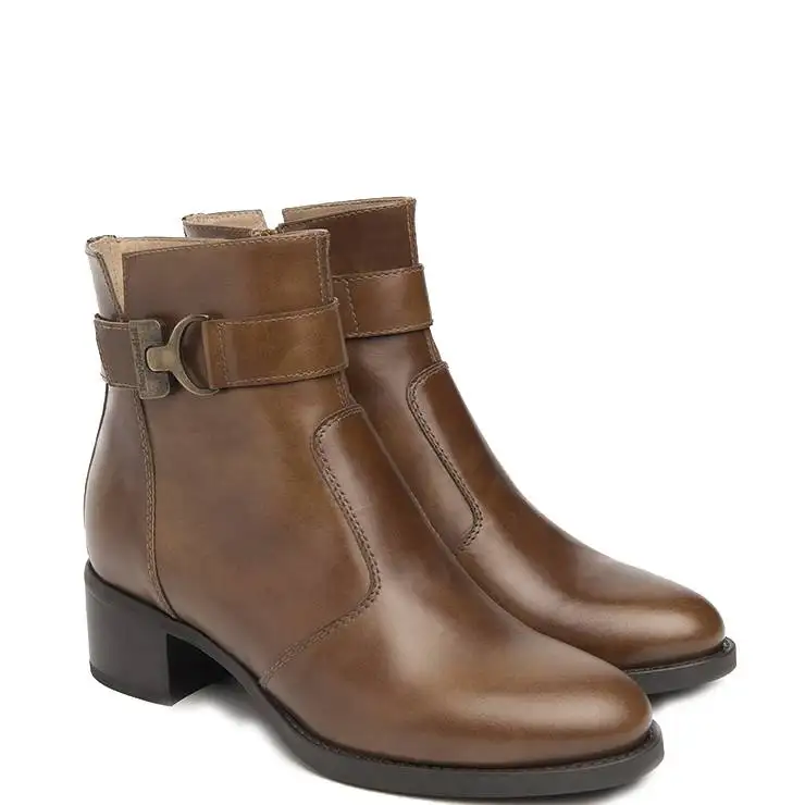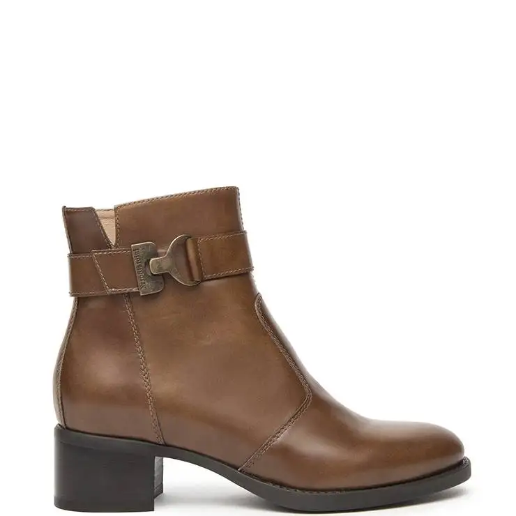 Botín bajo elaborado en piel. Suela de goma antideslizante. Tacón de bloque de 4 cm de altura. Plantilla extraíble. Cierre con cremallera lateral interna. Detalle de pulsera con eslabón en el tobillo.