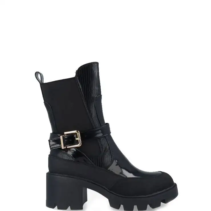 Botín estilo militar elaborado en textil y charol. Diseño con múltiples texturas. Forro textil y piel. Suela track de goma. Tacón bloque de 6 cm de altura.