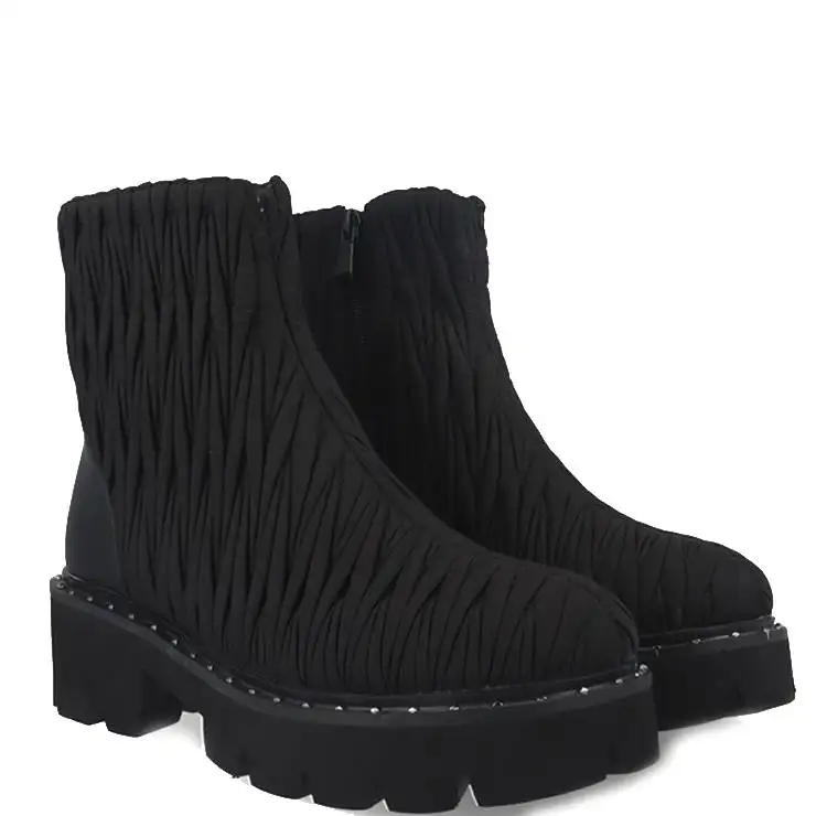 Botín elaborado en tejido acolchado. Suela de goma dentada de 4 cm de altura. Cierre con cremallera lateral interna.