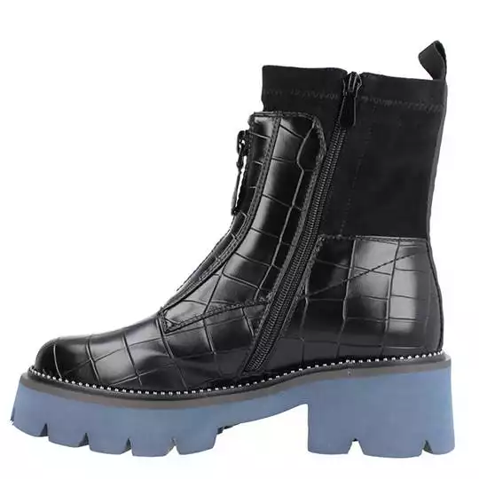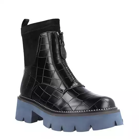 Botín de la marca Noa Harmon modelo 8462 John en color negro. Botín elaborado en piel coco con detalle de textil elástico en el cuello. Cremallera central en el empeine y cremallera lateral interior. Suela de goma en tono azulado de 2 a 5 cm de altura.