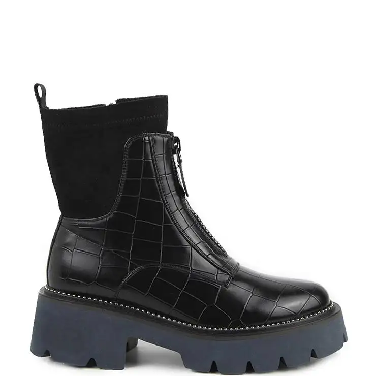 Botín de la marca Noa Harmon modelo 8462 John en color negro. Botín elaborado en piel coco con detalle de textil elástico en el cuello. Cremallera central en el empeine y cremallera lateral interior. Suela de goma en tono azulado de 2 a 5 cm de altura.
