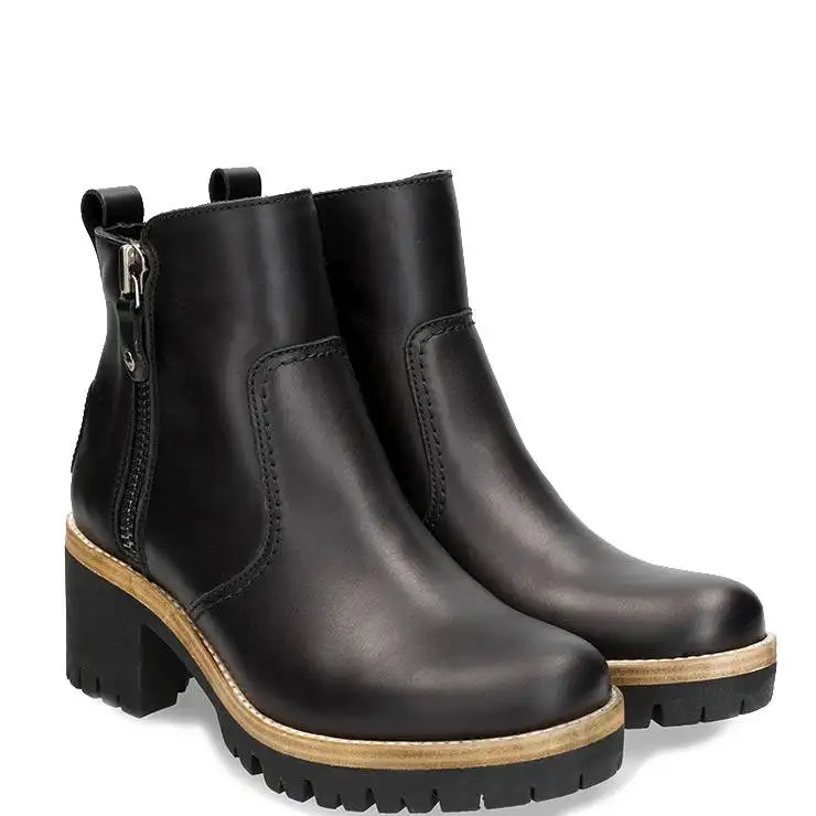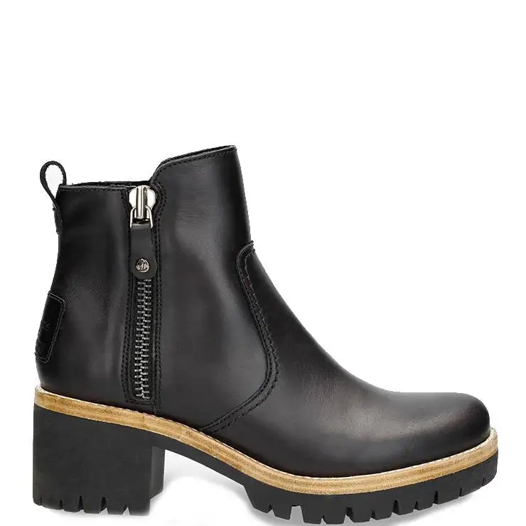 Botín de la marca Panama Jack, modelo Pauline en color negro. Botín confeccionado en piel lisa engrasada Waterproof. Detalle de cremallera lateral en interior y exterior. Forro y plantilla de piel. Suela de goma en color negro. Cierre con cremallera en lateral interior. Tacón ancho de 6,5cm. y plataforma de 2,5cm.