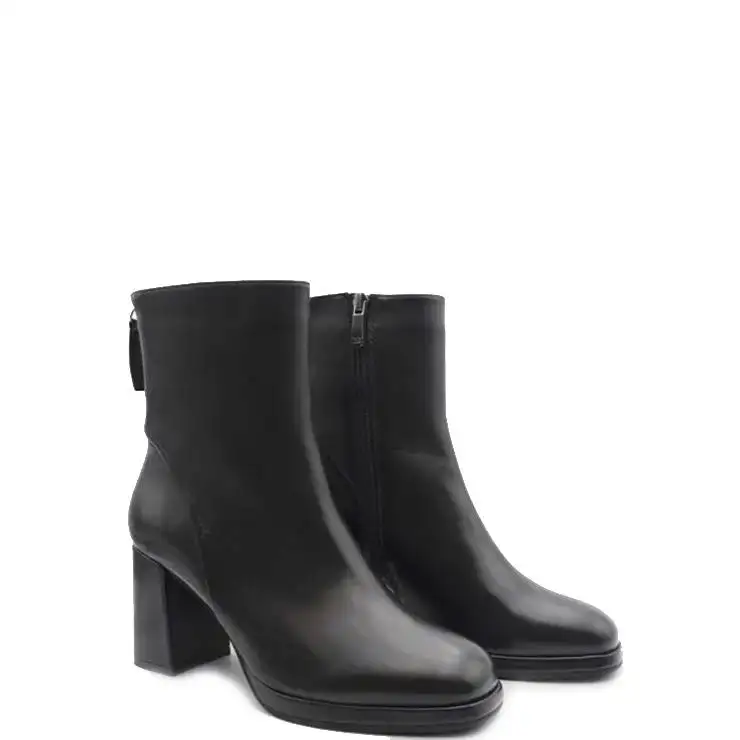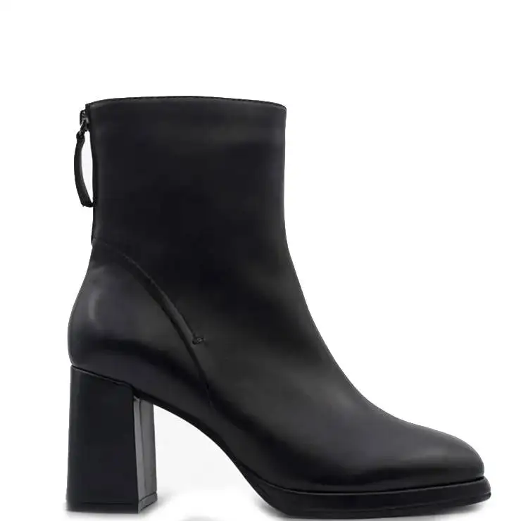 Botín elaborado en piel. Forro interior de terciopelo. Suela de goma y tacón de 6,5 cm de altura. Cierre con cremallera lateral y trasera.