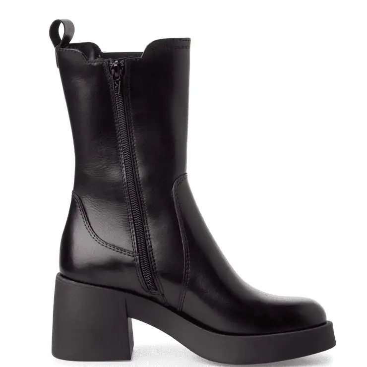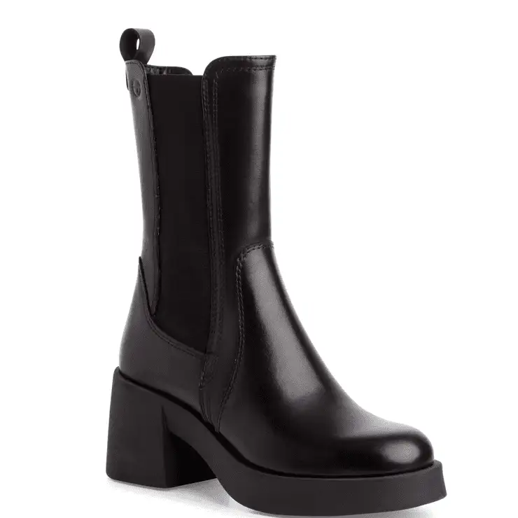 Botín tipo Chelsea elaborado en piel. Cierre con cremallera lateral interna y elástico lateral exterior. Suela de goma de 2 cm de altura y tacón bloque de 7,5 cm.