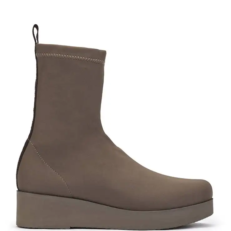 Botín de estilo calcetín elaborados en tejido elástico. Suela de goma al tono. Plataforma de 2 cm y cuña de 4 cm de altura. Sin cierre, tirador trasero para facilitar el calce.