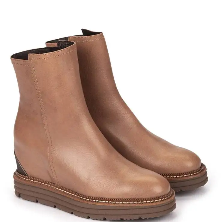 Botín elaborada en piel. Cierre con cremallera lateral interna. Suela de goma de 4 cm y cuña interna de 6 cm de altura.