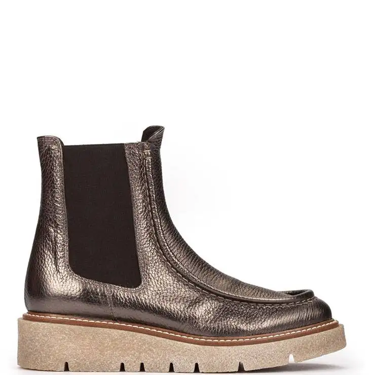 Botín elaborada en piel metalizada. Elásticos en los laterales. Suela de goma crepé de 2 a 4 cm de altura. Sin cierre.