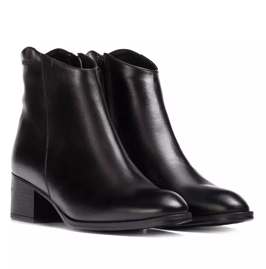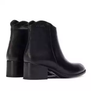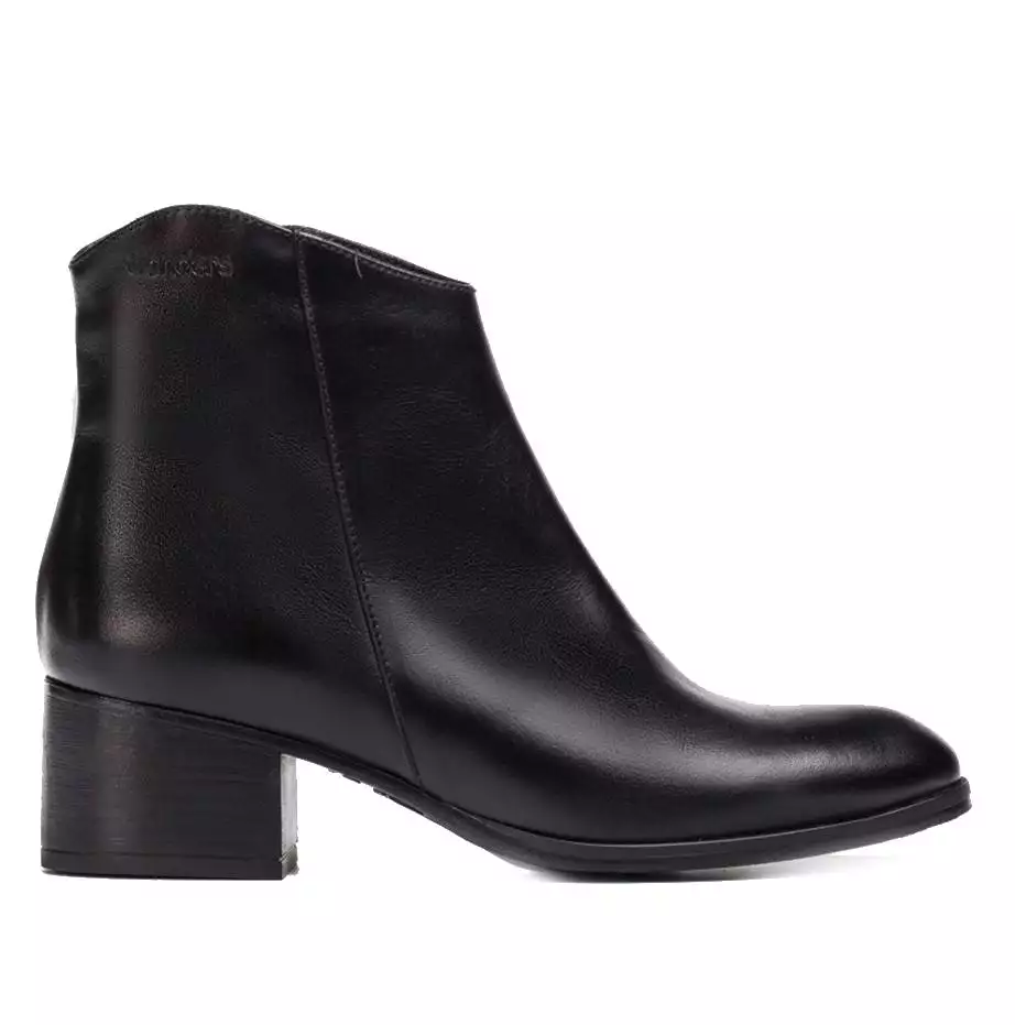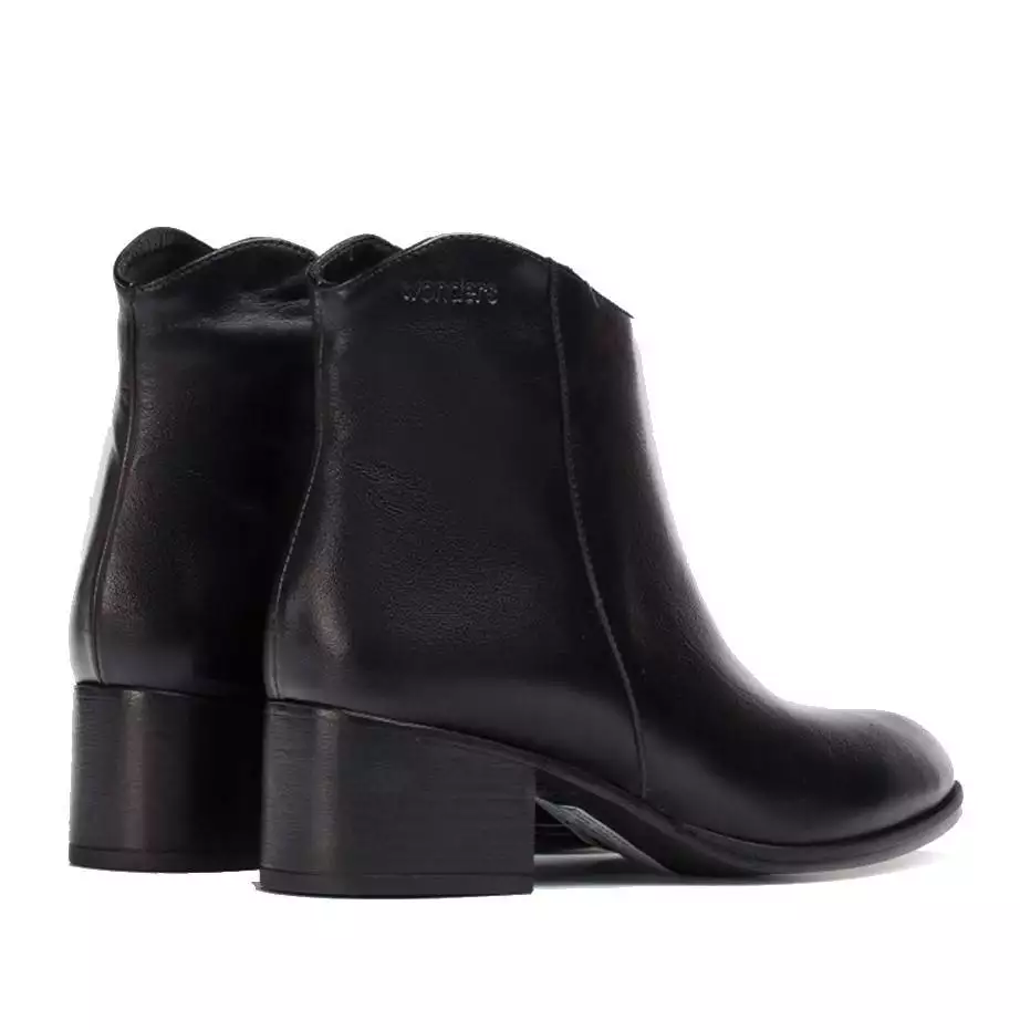 Botín de la marca Wonders, modelo Easy en color negro. Botín de tacón de piel negra lisa estilo Riding. Escote en V y cierre de cremallera lateral. Forro en combinación de piel y microfibra transpirable. Suela de goma flexible y tacón de 5 cm de altura.