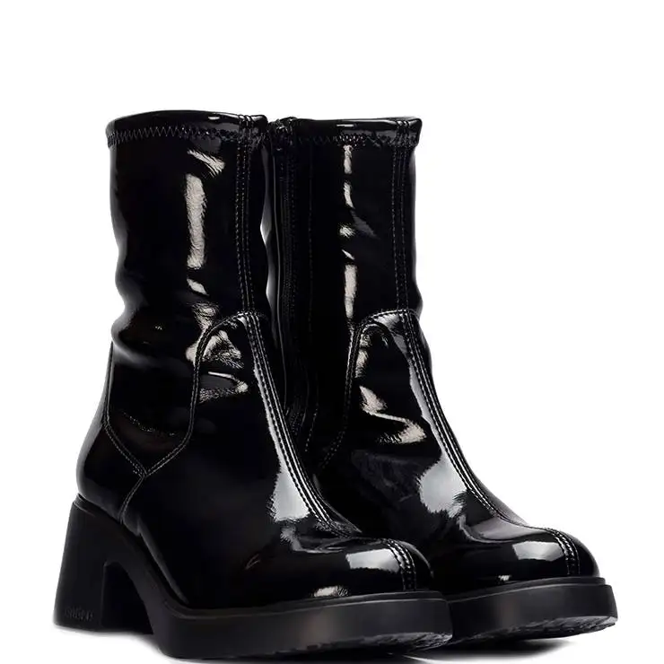 Botín elaborado en elastano acharolado. Cierre mediante cremallera lateral. Suela de goma EVA expandida WondersFly™. Plantilla interior de MemoryGel. Tacón bloque de 6 cm de altura.