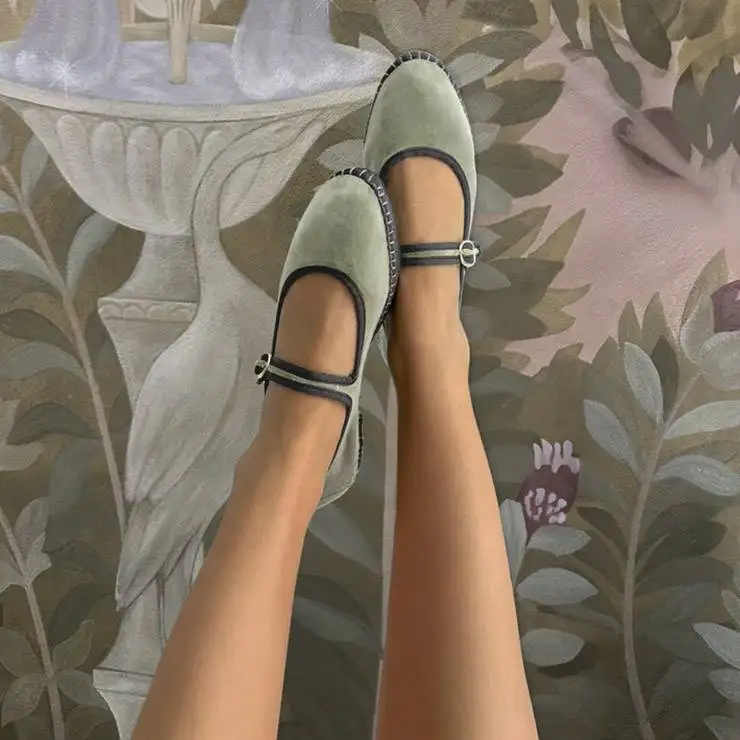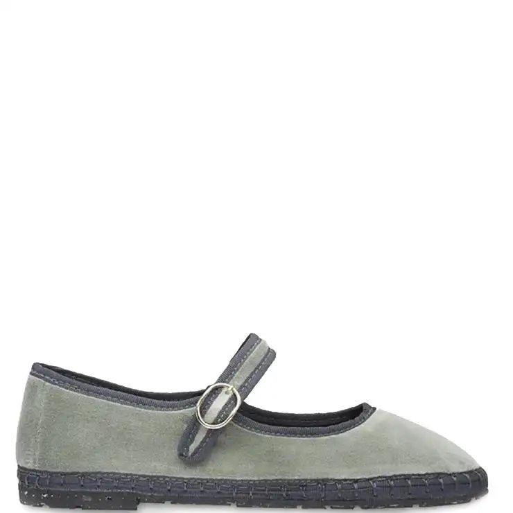 Mercedita de terciopelo de algodón con ribetes en gris claro y cierre de hebilla. Interior en algodón orgánico con tratamiento antibacteriano. Suela hecha de caucho producido a partir de neumáticos de bicicleta reciclados.