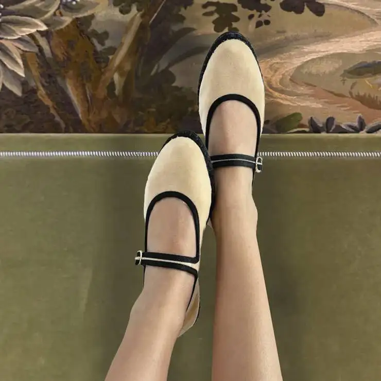 Mercedita de terciopelo de algodón con ribetes negros y cierre de hebilla. Interior en algodón orgánico con tratamiento antibacteriano. Suela hecha de caucho producido a partir de neumáticos de bicicleta reciclados.