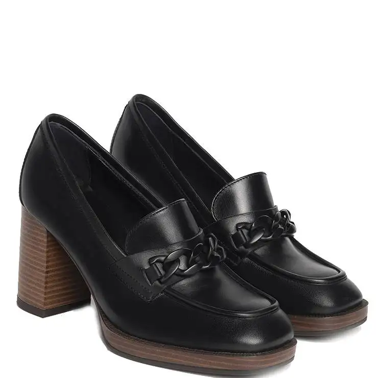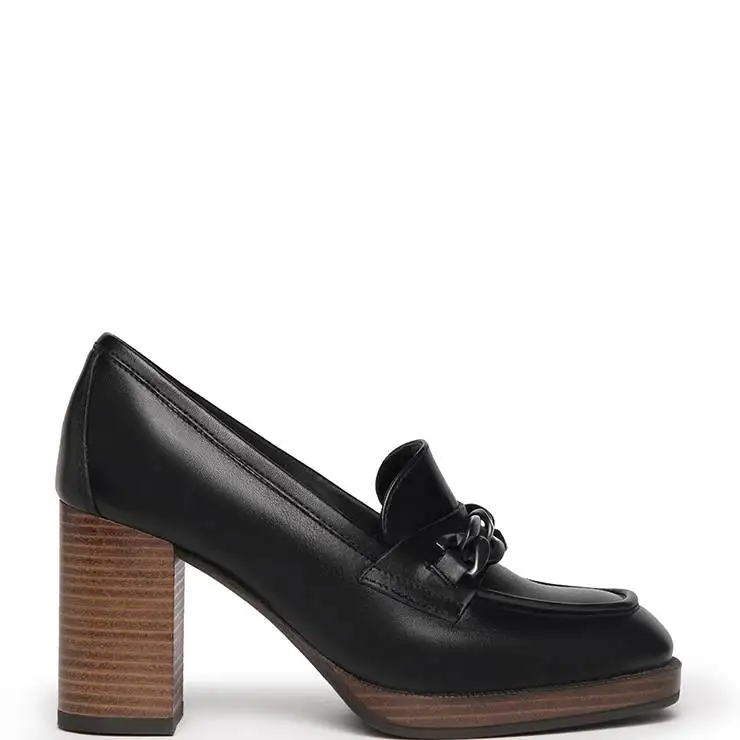Mocasín de tacón elaborado en piel. Tacón cuadrado de 8,5 cm de altura. Detalle de cadena al tono en el empeine. Suela marrón acabado en goma.