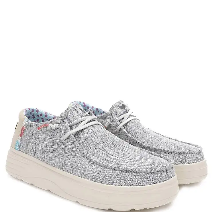 Náutico tipo wallabi elaborado en textil jaspeado. Detalles bordados y trasera en serraje. Plantilla extraíble en EVA forrada en piel. Suela EVA ultraligera de 4,5 cm. Cierre con cordones elásticos.