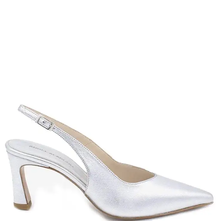 Salón destalonado en piel metalizada. Tacón fino de 6,5 cm de altura. Cierre ajustable con hebilla. Punta afilada.