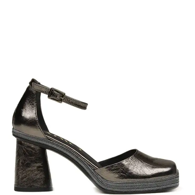 Zapato tipo salón abierto elaborado en piel metalizada. Puntera cuadrada, detalle de banda trenzada de piel en el piso. Cierre ajustable con hebilla. Forro y plantillas acolchadas transpirables. Suela de caucho de 2,6 cm y tacón forrado en piel de 8,5 cm de altura.
