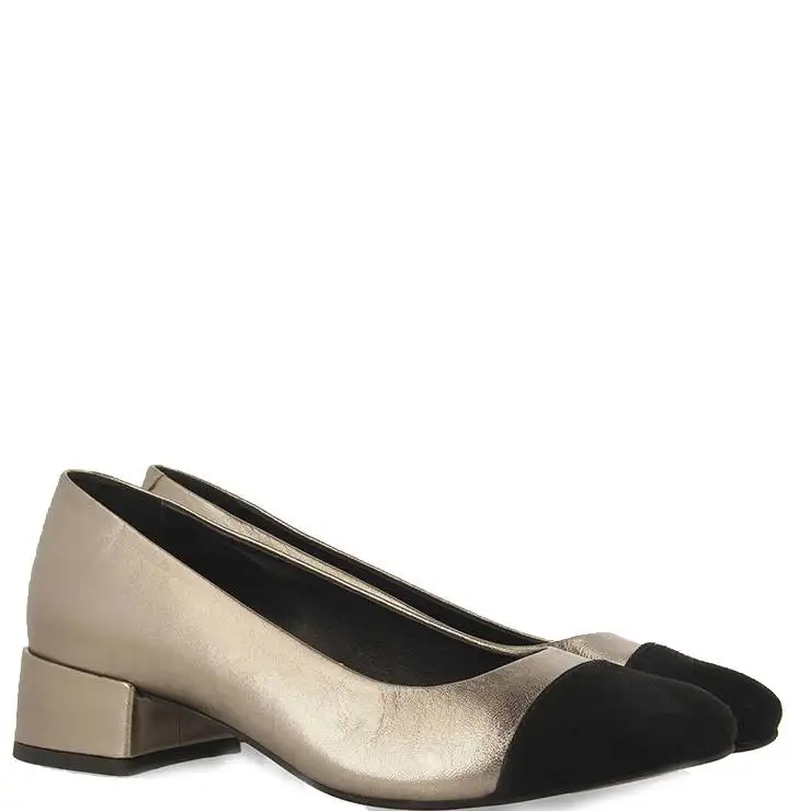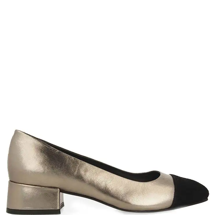 Zapato tipo salón elaborado en piel curtida metalizada con puntera en nobuck negro. Tacón ancho de 4 cm de altura.