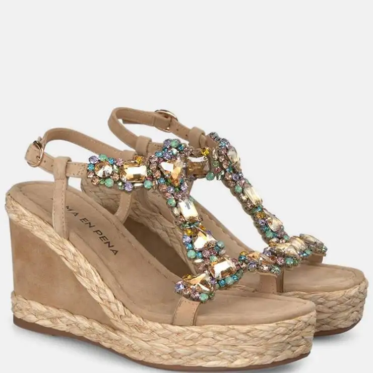 Sandalia de cuña alta elaborada en ante. Detalle de pedrería multicolor en el empeine. Cierre con hebilla ajustable en el tobillo. Suela acolchada con cuña en ante y rafia trenzada. Cuña de 9,5 cm de altura.
