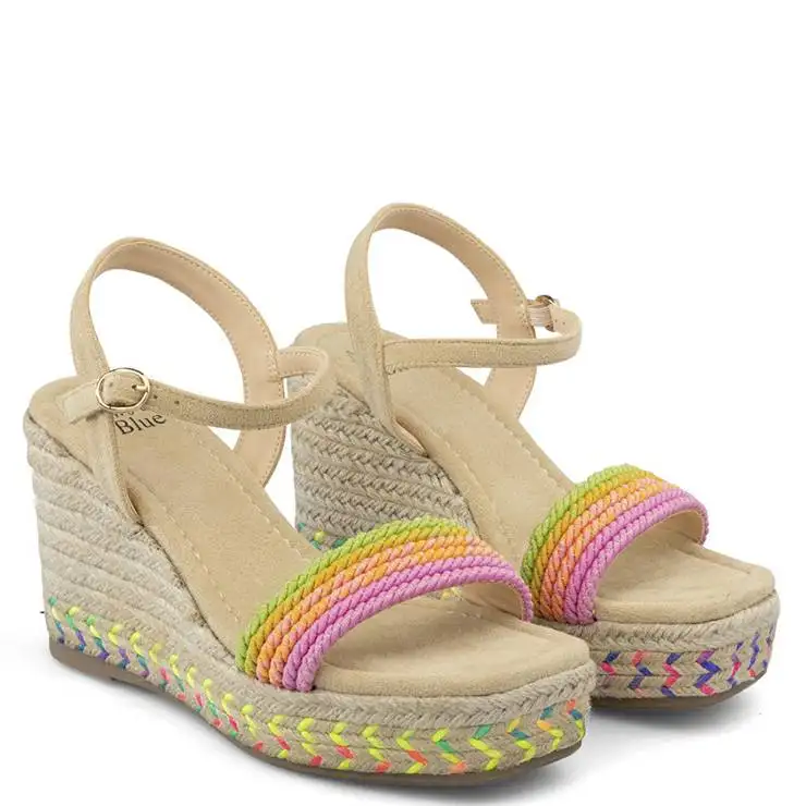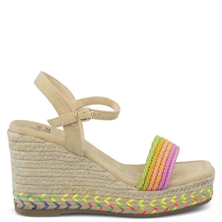 Sandalia cuña con tiras trenzadas en cuerdas de diferentes colores en la parte delantera.